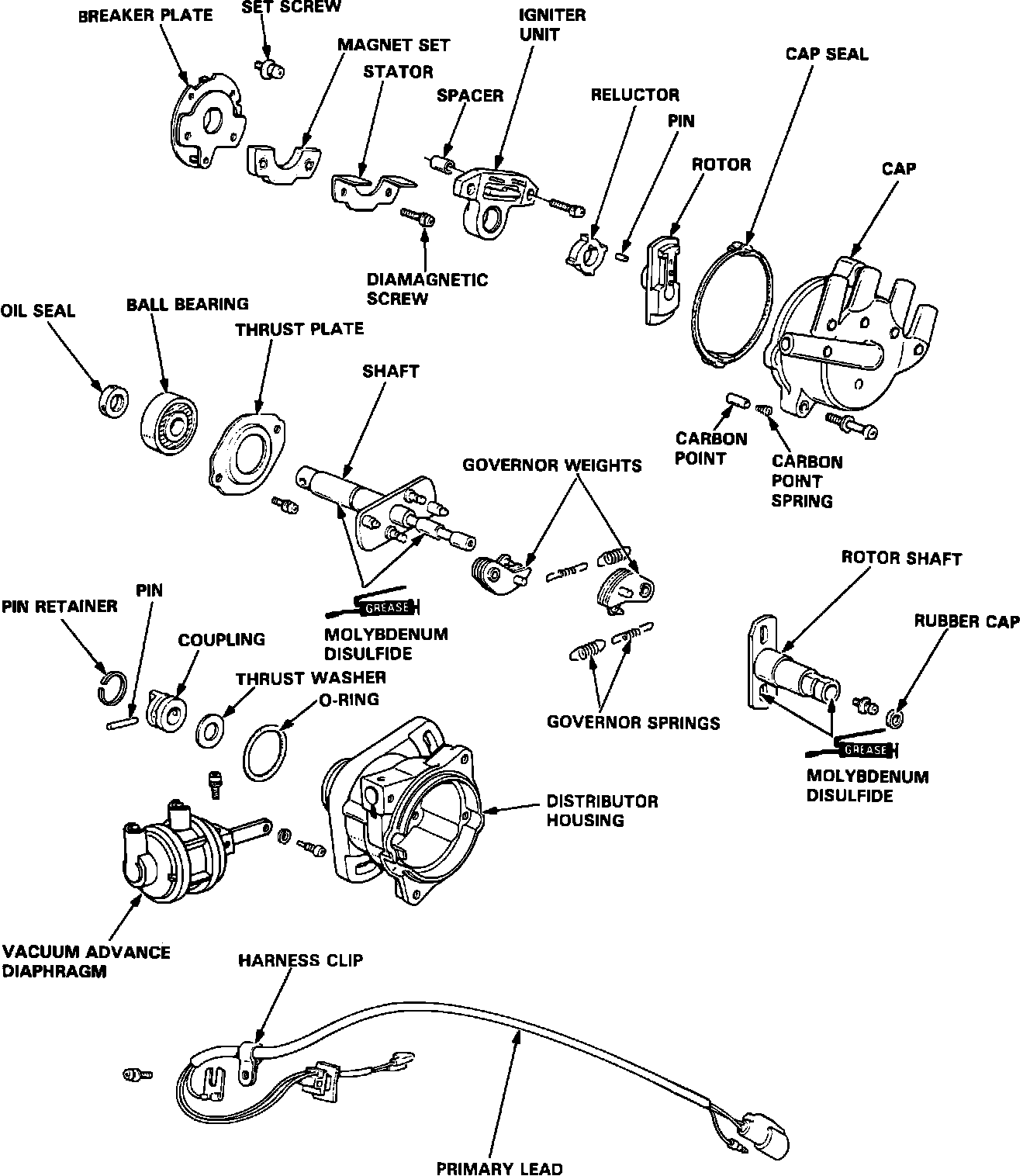 Within the distributor there are two governor weights and four governor springs. These weights and springs are attached to the distributor shaft. A rotor shaft is also attached to the distributor shaft.