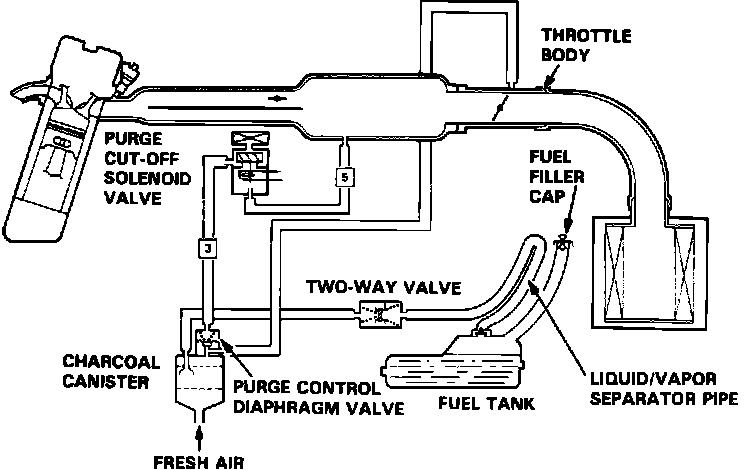 Canister purging is accomplished by drawing fresh air through the canister and into a port on the throttle body. The purging vacuum is controlled by the purge control diaphragm valve and the purge cut-off solenoid valve.