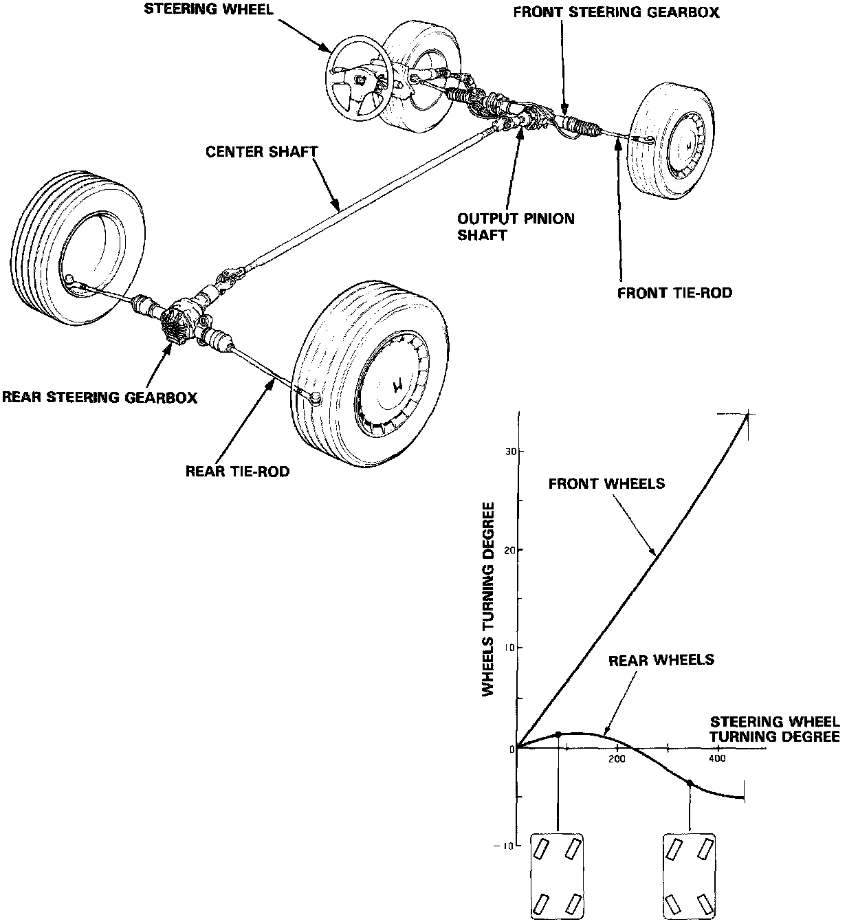 System DesignThe system is comprised of two sub-systems, a front steering gearbox for the front wheels, and a rear steering gearbox for the rear wheels. These two sub-systems are mechanically linked by a center shaft. When the driver turns the steering wheel, the rack and pinion in the front steering gearbox moves the rack in the axial direction. The rack steers the front wheels, and simultaneously rotates an output pinion shaft via another rack and pinion in the gearbox. This output pinion shaft transmits the turning angle of the steering wheel to the rear steering gearbox via the center shaft A stroke rod in the rear steering gearbox moves in the axial direction to steer the rear wheels via the tie rods.