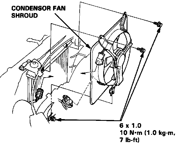 4. Loosen the under mounting bolt, and remove the tow upper mounting bolts and condenser fan shroud.