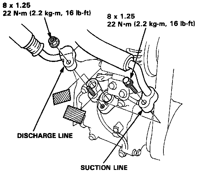 5. Remove the tow bolts, and disconnect the suction line and discharge line from the compressor.