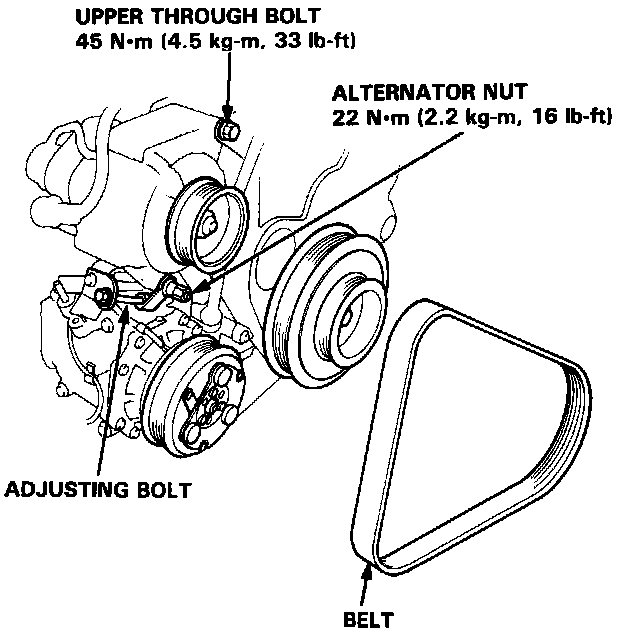 7. Loosen the upper through bolt and alternator nut, then turn the adjusting bolt and remove the belt.