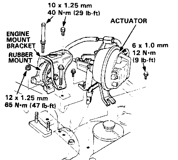 1. Remove the engine support bolts and nuts, then remove the side mount rubber, side mount bracket and actuator (with cruise control).
