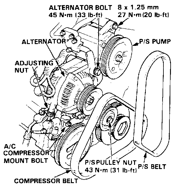 NOTE: On cars with air conditioning (A/C): Remove the A/C compressor mount bolts, then remove the A/C compressor and the belt.