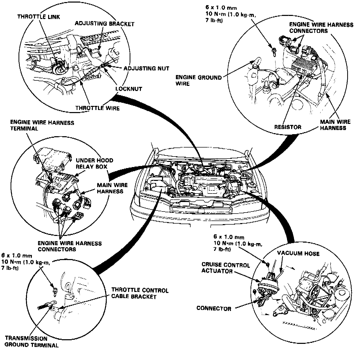 19. Disconnect the three engine wire harness connectors from the main wire harness at right side of engine compartment, and remove the engine wire harness terminal and the starter cable terminal from the under-hood fuse/relay box and clamps. Then remove the transmission ground terminal.