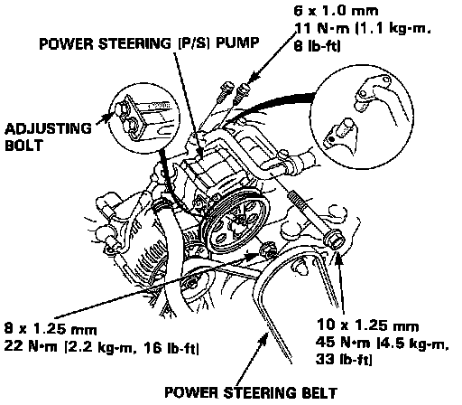 22. Remove the mounting bolt, nut and V-belt from the power steering pump, then remove the bolts and pipe. Loosen the adjusting bolt. Pull the pump away from the mounting bracket.