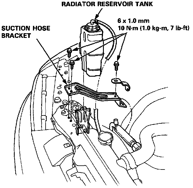 1. Use a Refrigerant Recovery/Recycling System to recover the refrigerant from the system.2. Temporarily remove the radiator reservoir tank and intake tube, then remove the suction hose bracket.