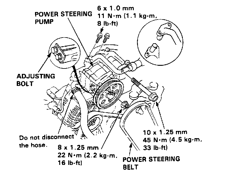 3. Remove the mounting bolt, nut and V-belt from the power steering pump, then remove the bolts and nuts. Loosen the adjusting bolt. Pull the pump away from the mounting bracket.