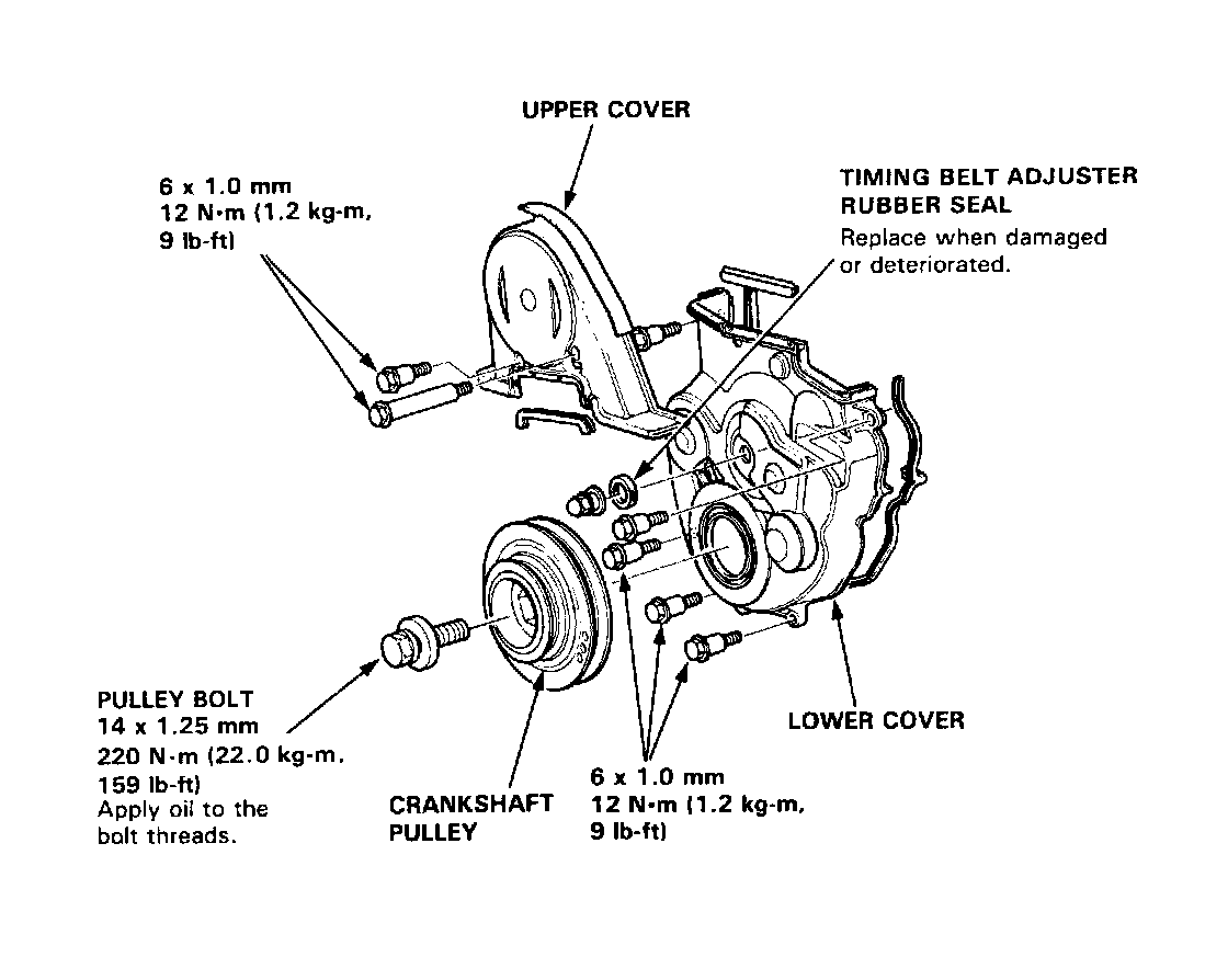 15. Coat the threads and seat face of the pulley bolt with engine oil, and tighten to the specified torque.