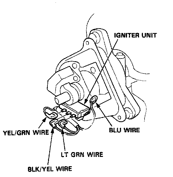 4. Turn the ignition switch ON and check for battery voltage between the LT GRN wire and body ground. If there is no battery voltage check the ignition coil for proper operation or for an open circuit on the LT GRN (BLK/WHT) wire between the ignition coil and the igniter unit. If there is battery voltage proceed to step 5.
