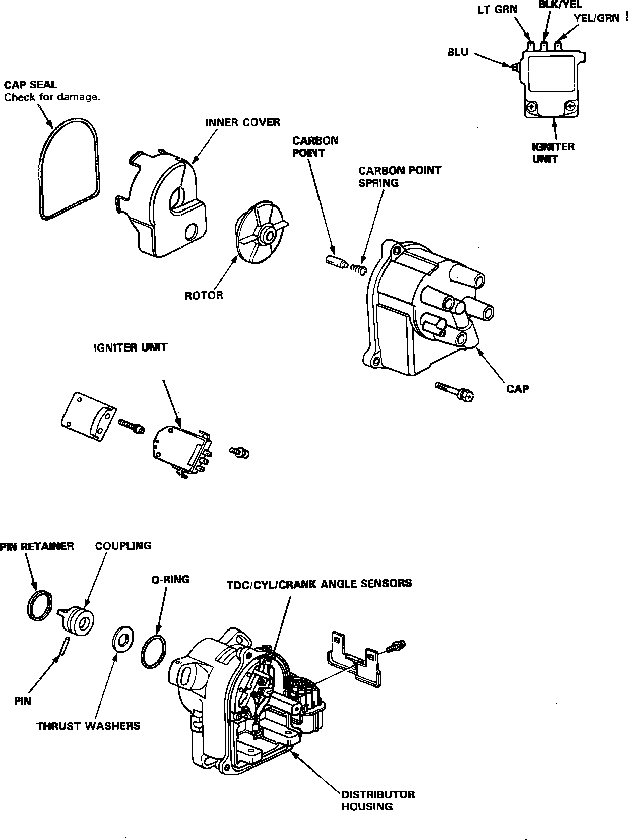 The distributor acts as a rotary switch, distributing the firing voltage at the instant of ignition to the spark plugs in a pre-set sequence. The distributor is driven by the camshaft and is located on the right side of the engine. This distributor has an internal coil and ignitor unit and gets signals electronically by the the PGM-FI system.