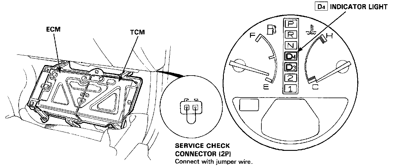 TROUBLESHOOTING PROCEDURESWhen the TCM senses an abnormality in the input or output Systems, the [D4] indicator light in the gauge assembly will blink. However, when the Service Check Connector (located to the lower right of the glove compartment) is connected with a jumper wire, the [D4] indicator light will blink the Diagnostic Trouble Code (DTC) when the ignition switch is turned on.