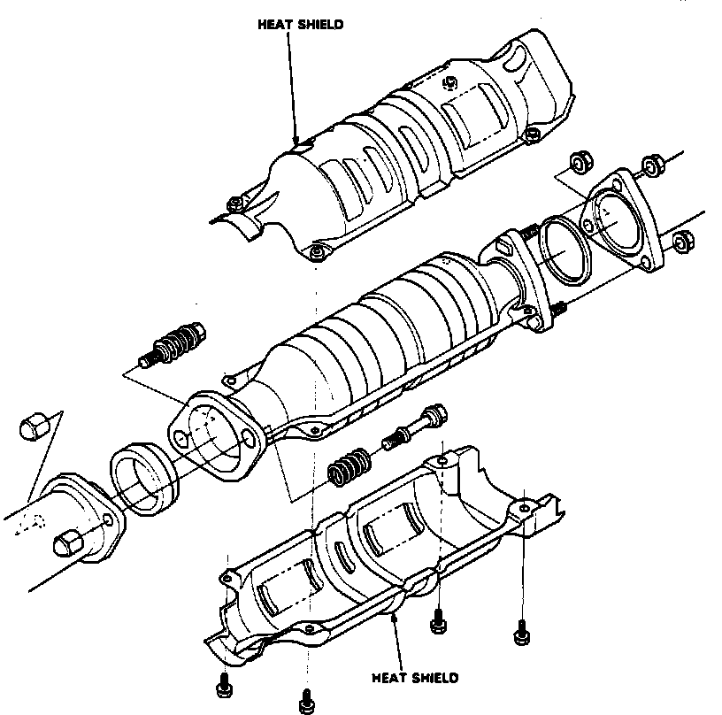 If excessive exhaust system back-pressure is suspected or if tail-pipe emissions are too high (while all other systems check OK), remove the catalytic converter from the car and make a visual check for plugging, melting or cracking of the ceramic grid inside. If any of the visible areas are damaged, replace the catalytic converter.