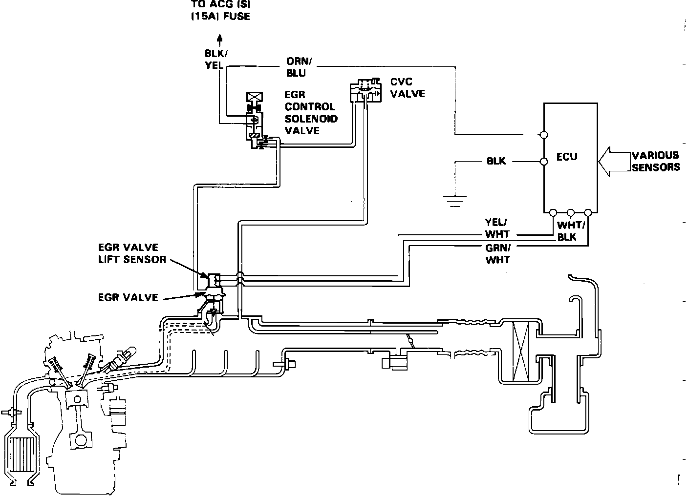 The EGR system is designed to reduce the emission of oxides of nitrogen (NOx), by recirculating exhaust gas through the EGR valve and the intake manifold into the combustion chambers. The EGR system is composed of the EGR valve, constant vacuum control (CVC) valve, EGR control solenoid valve, ECU (PGM FI control unit) and various sensors.