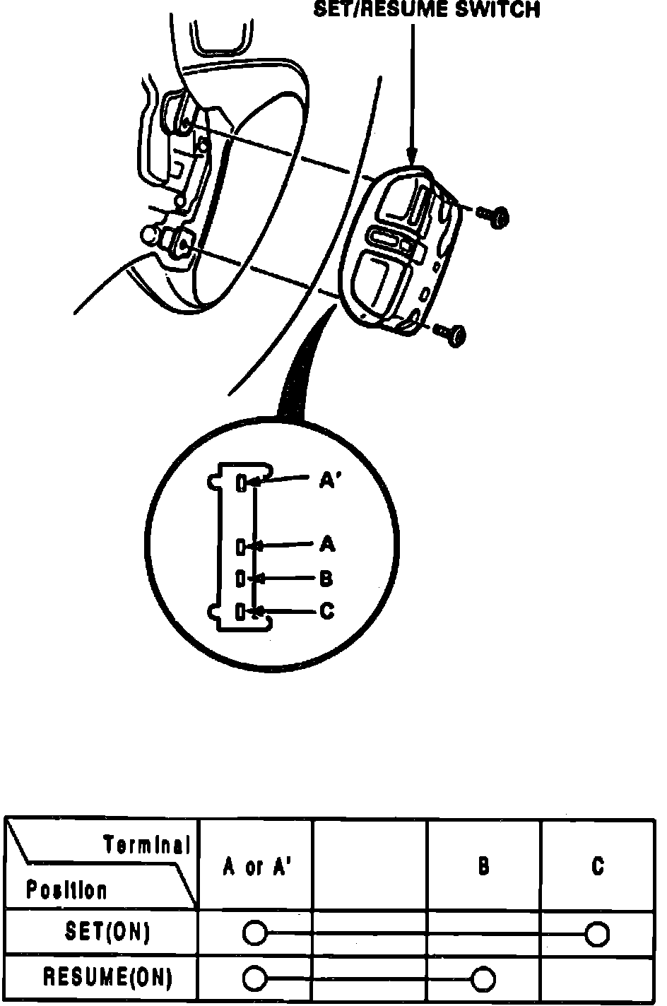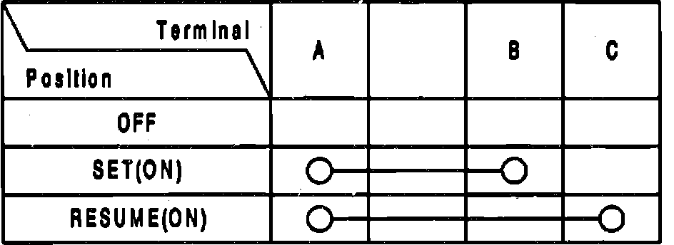 4. If continuity is as described in table, set/resume switch is functioning properly.
