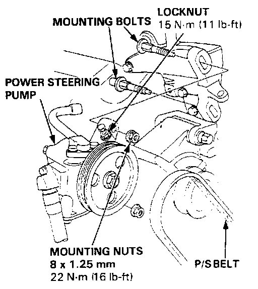 3. Remove the mounting bolts, nuts and belt from the power steering (P/S) pump.