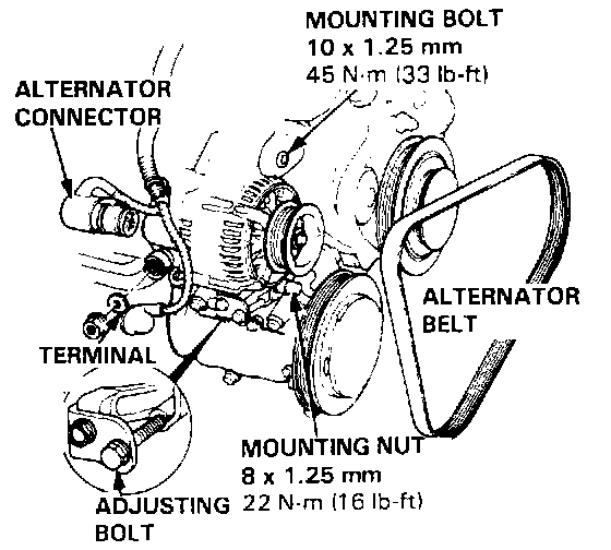 5. Loosen the alternator mounting bolt, nut and the adjusting nut, then remove the alternator belt.