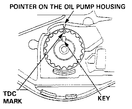 25. Align the groove on the front balancer shaft pulley with the pointer on the oil pump housing as shown.
