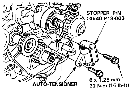 20. Insert a flat blade screwdriver into the maintenance hole. Place the stopper (P/N 14540-P13-003( on the auto tensioner while turning the screwdriver clockwise to compress the bottom.