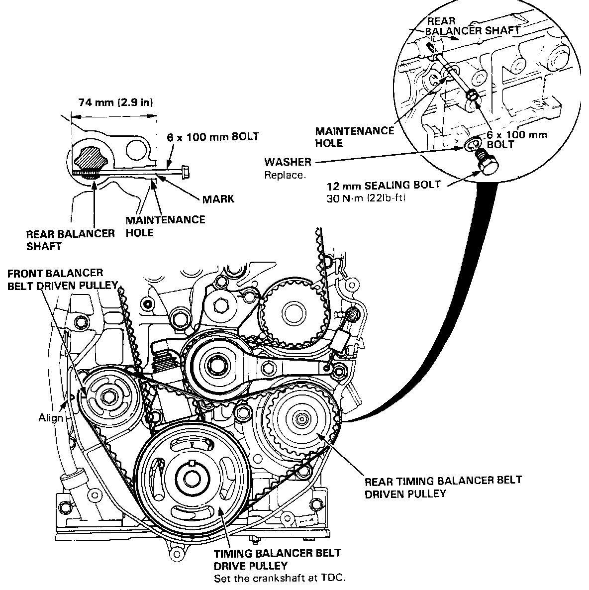 28. Install the timing balancer belt. Remove the 6 x 100 mm bolt from the rear balancer shaft.