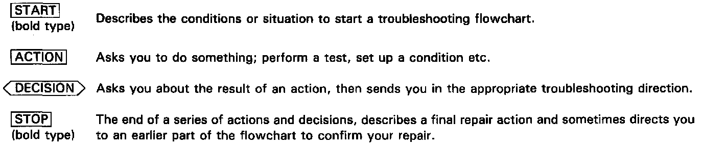 A flowchart is designed to be used from start to final repair. It's like a map showing you the shortest distance. But beware: if you go off the "map" anywhere but a "stop" symbol, you can easily get lost. The image shows a list of symbols and their respective definitions. These symbols will show up in the flow charts.