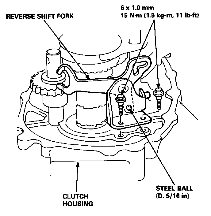 5. Install the reverse shift fork in the clutch housing with the 5th/reverse shift piece pin positioned in the slot of the reverse shift fork.