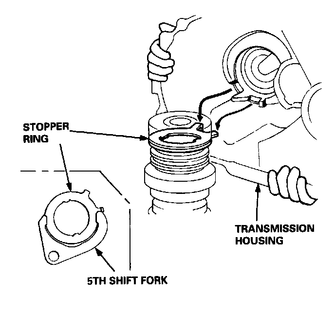 NOTE: Align the long arm of 5th shift fork with the hook on the stopper ring.