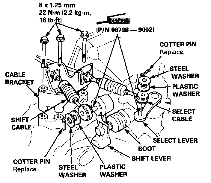 21. Install the shift cable and select cable to the shift lever and to select lever respectively.