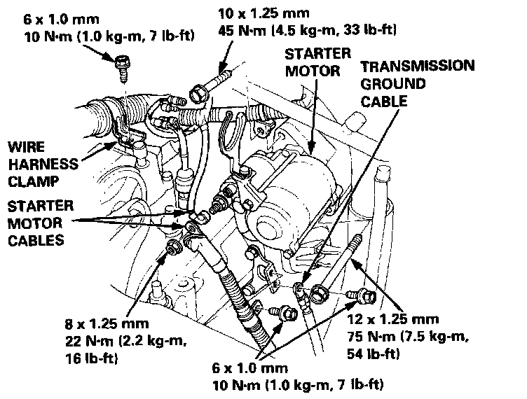 NOTE: When installing the starter motor cable, make sure that the crimped side of the ring terminal is facing out.