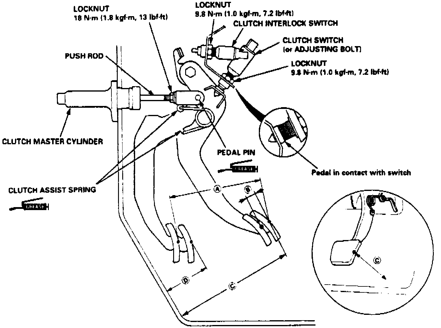 5. Loosen clutch interlock switch locknut and measure clearance between floor board and clutch pedal with clutch pedal fully depressed.