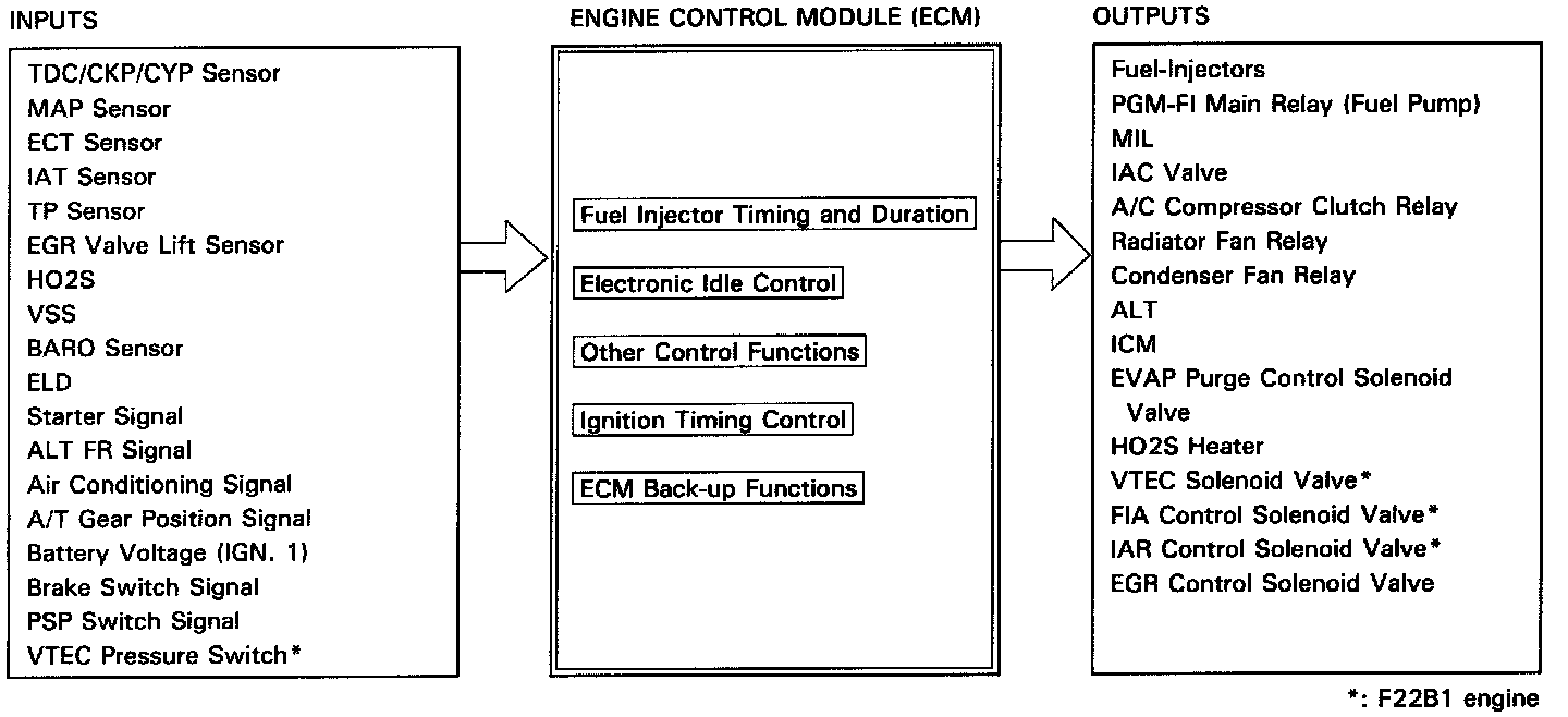 ^ Fuel cut-off action also takes place when engine speed exceeds 6,500 rpm (F22B1 engine), 6,600 rpm (F22B2 engine) regardless of the position of the throttle valve to protect the engine from over-running.