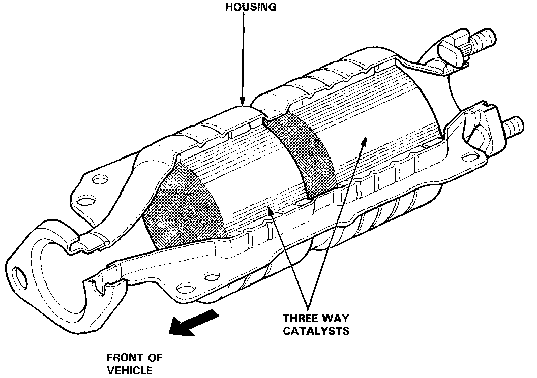 The TWC is a monolythic three-way device that uses catalytic compounds applied to an integrally constructed honeycomb carrier surface in the center of the exhaust pipe.