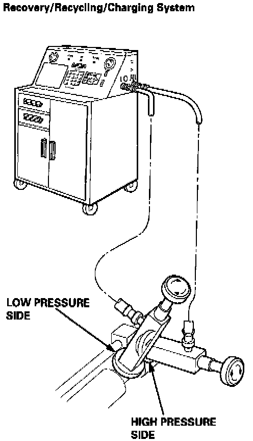 1. Connect a R-134a refrigerant Recover/Recycling/Charging System to the car, as shown, following the equipment manufacturer's instructions.