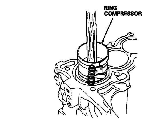 NOTE: Maintain downward force on the ring compressor to prevent rings from expanding before entering the cylinder bore.