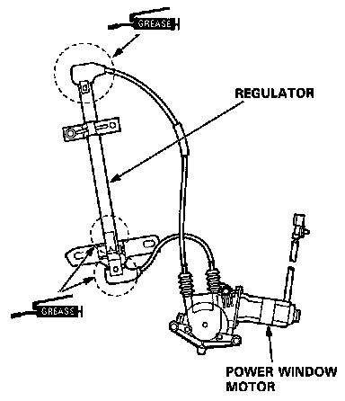6. Grease all the sliding surfaces of the regulator where shown. Check that the regulator moves smoothly by connecting the regulator handle or a 12 V battery to the power window motor.