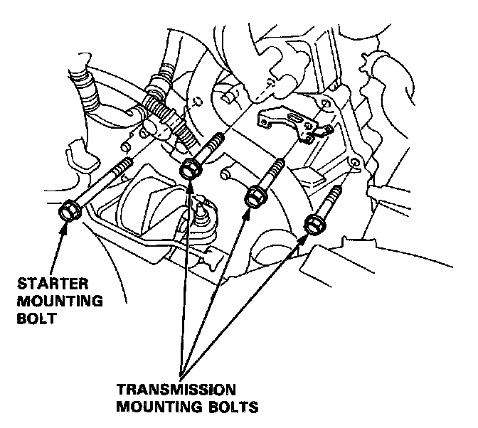 16. Remove the three upper transmission mounting bolts and the lower starter mounting bolt.