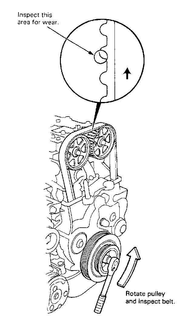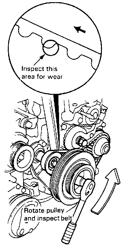 7. Inspect the timing belt for cracks and oil or coolant soaking.