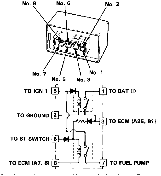 2. Attach the battery positive terminal to the No. 6 terminal and the battery negative terminal to the No. 8 terminal of the PGM-FI main relay. Then check for continuity between the No. 5 terminal and No. 7 terminal of the PGM-FI main relay.