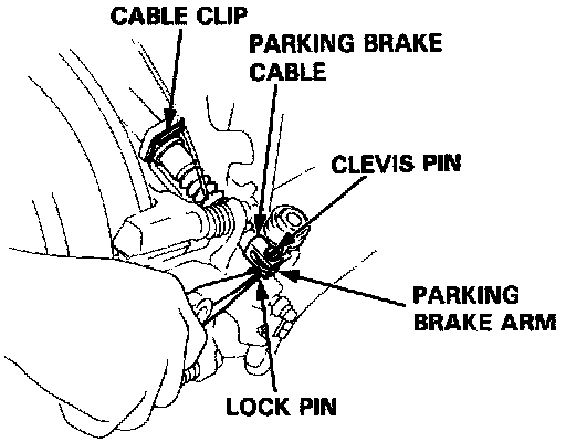 2. Remove the lock pin and clevis pin. Remove the cable clip and disconnect the cable from the parking brake arm.