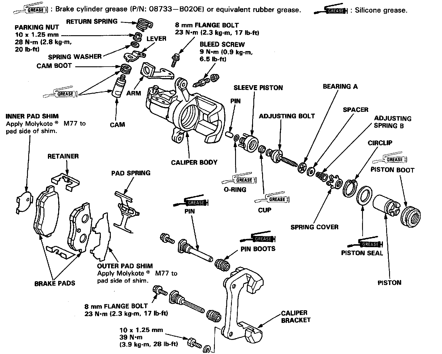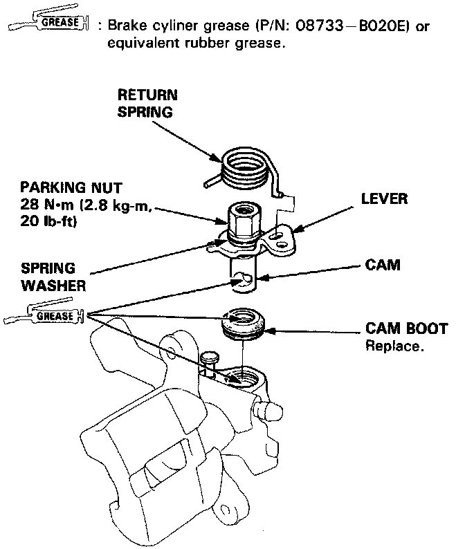 - When the cam and lever were separated, be sure to assemble them before installing the cam in the caliper body. Install the lever and spring washer apply locking agent to the threads, and tighten the parking nut while holding the lever with a vise.