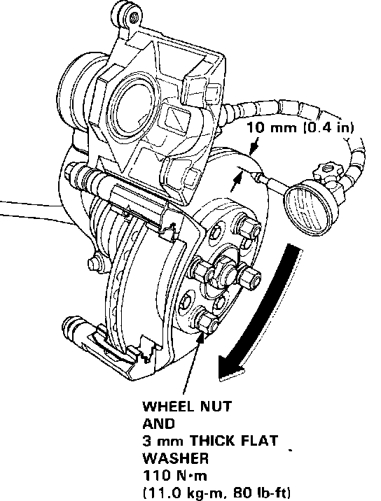 Install flat washers and wheel nuts to hold the disc. Torque to 110 Nm (11 kg-m, 80 lb-ft)