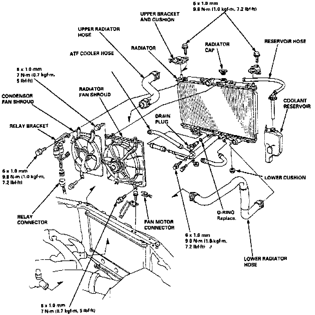 2. Disconnect fan motor electrical connections, then remove radiator upper brackets.