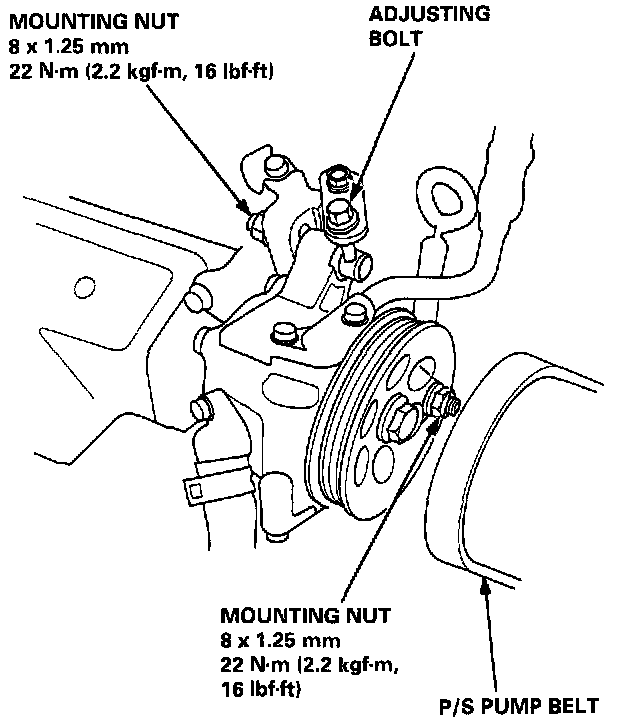 3. Loosen the adjusting bolt and mounting nuts, then remove the power steering (P/S) pump belt.