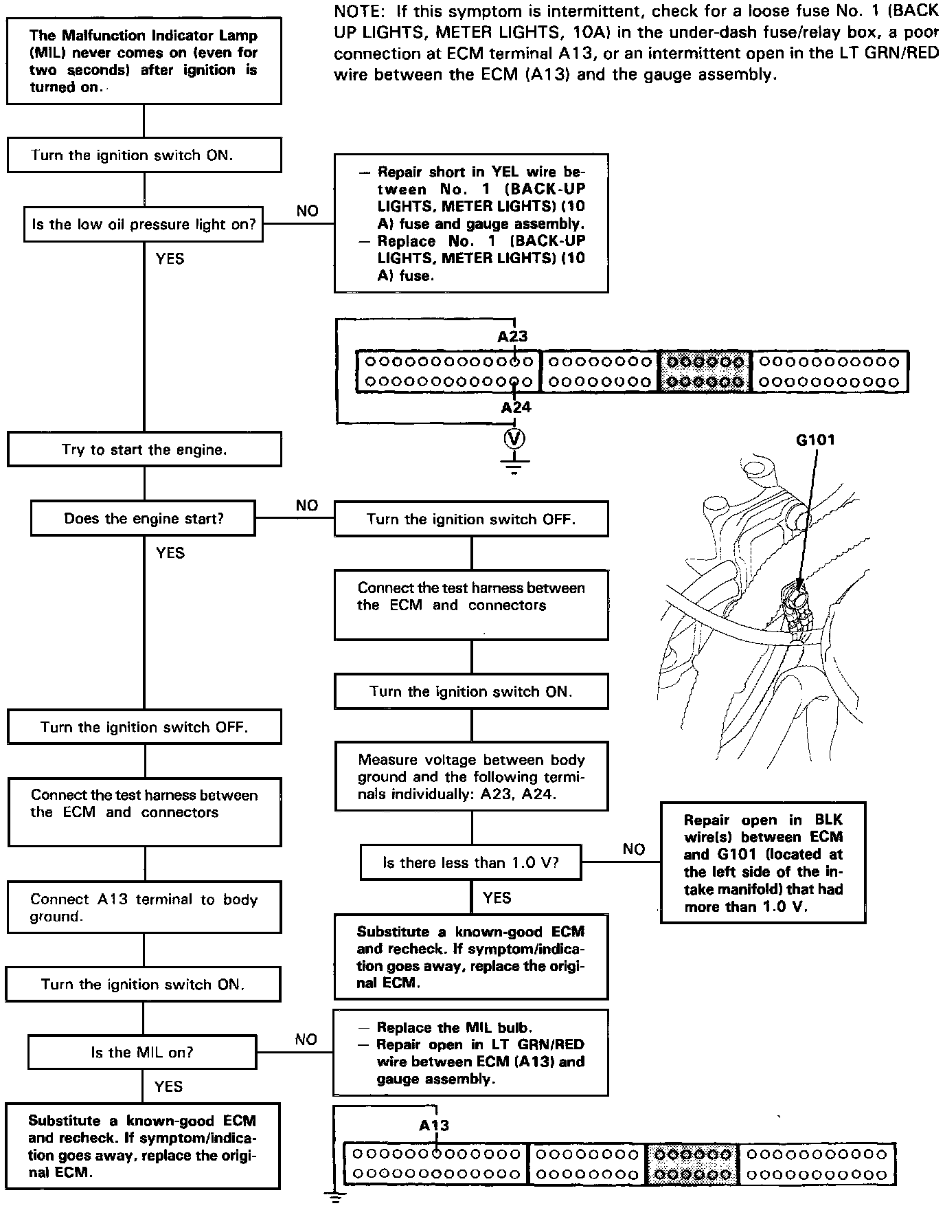 NOTE: If this symptom is intermittent, check for a loose fuse No. 1 (BACK up LIGHTS, METER LIGHTS, 10 A) in the under-dash Fuse/Relay Box, a poor connection at Engine Control Module (ECM) Terminal A 13, or an intermittent open in the LT GRN/RED wire between the ECM (A 13) and the Gauge Assembly.