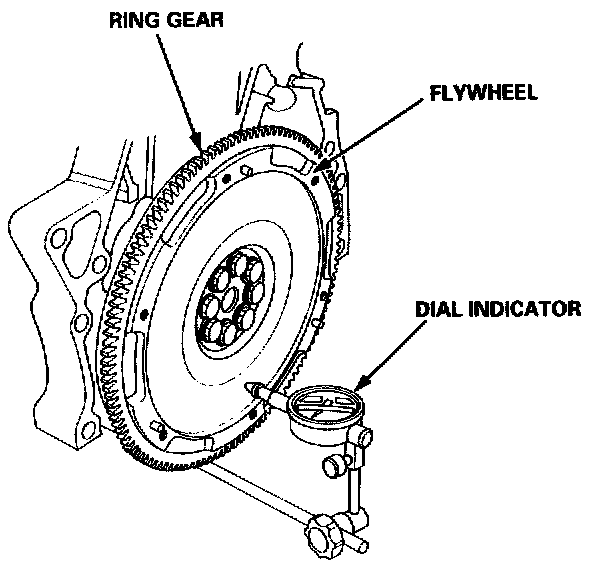 3. Measure the flywheel runout using a dial indicator through at least two full turns. Push against the flywheel each time you turn it to take up the crankshaft thrust washer clearance.