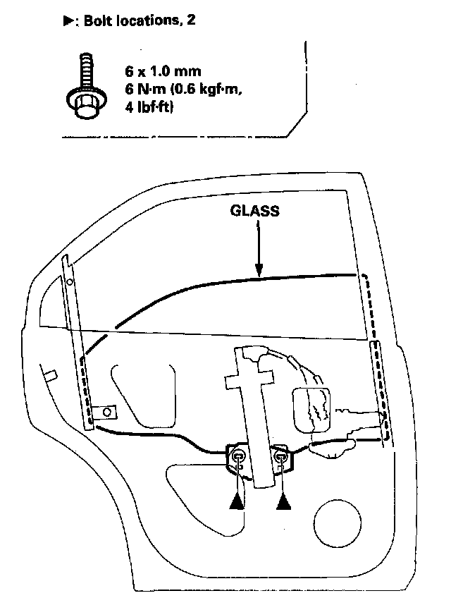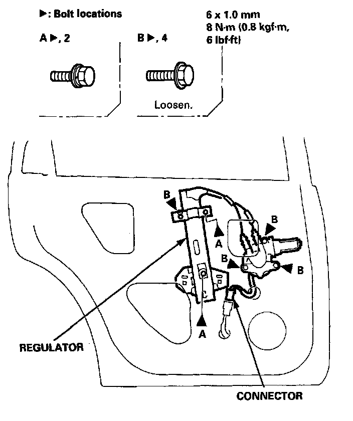 8. Disconnect the connector, then remove the regulator through the center hole in the door.