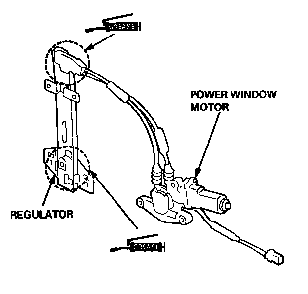 12. Grease all the sliding surfaces of the regulator where shown. Check that the regulator moves smoothly by connecting a 12 V battery to the power window motor.
