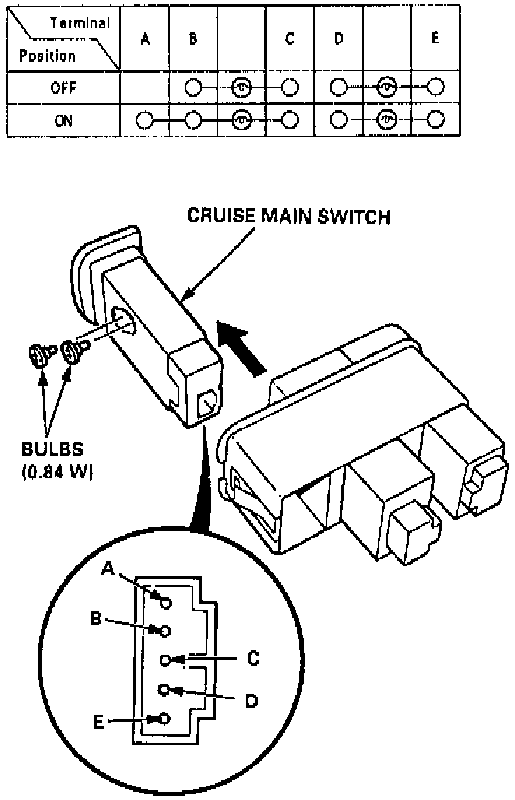 1. Carefully remove switch from instrument panel and disconnect electrical connectors.2. Remove cruise control switch from switch panel.