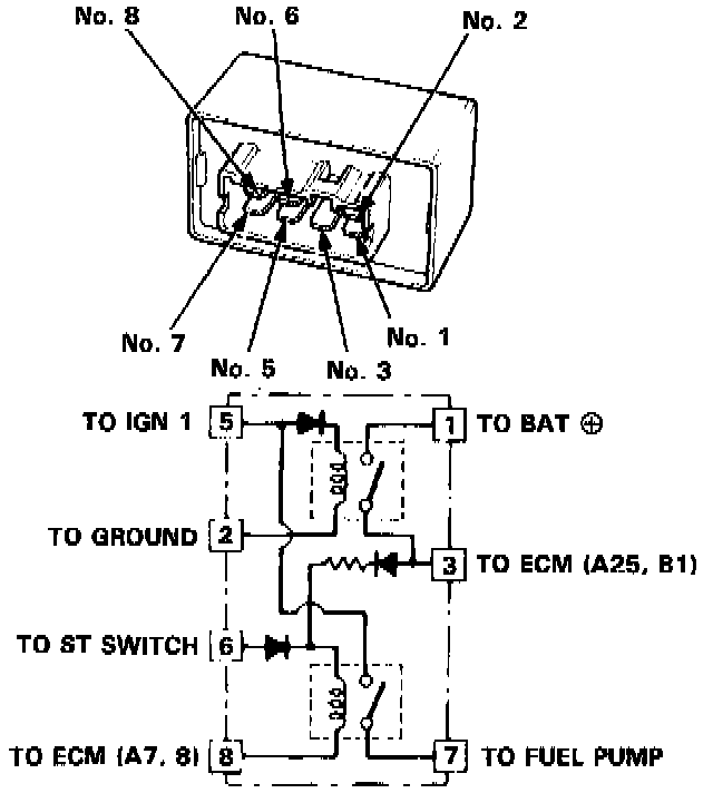 2. Attach the battery positive terminal to the No. 6 terminal and the battery negative terminal to the No. 8 terminal of the PGM-FI main relay. Then check for continuity between the No. 5 terminal and No. 7 terminal of the PGM-FI main relay.