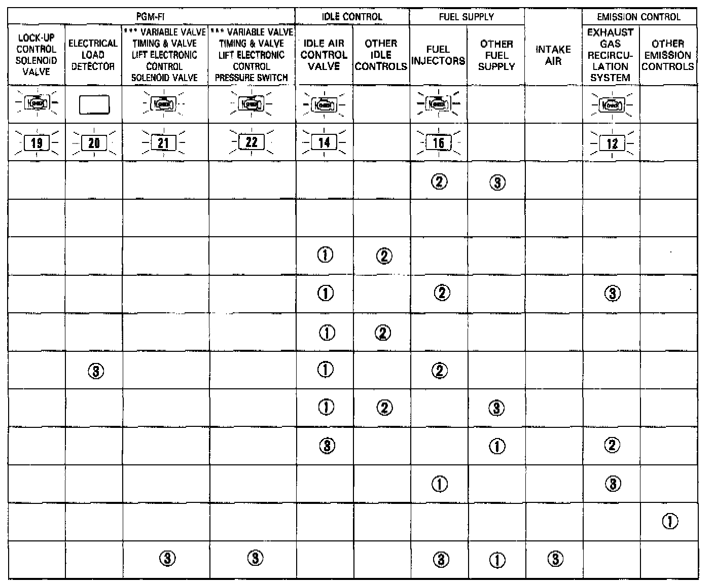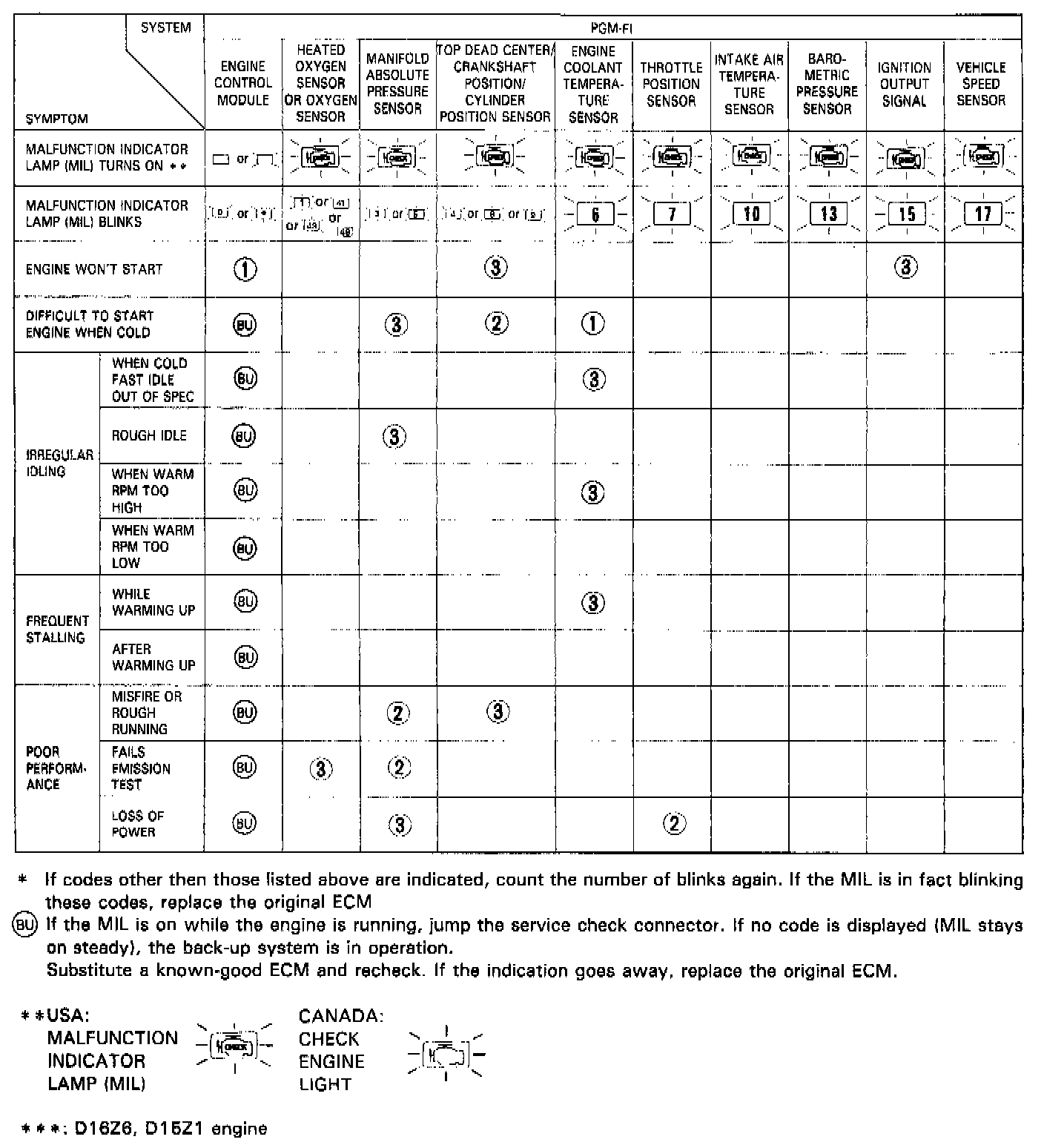 NOTE: Across each row in the chart, the systems that could be sources of a symptom are ranked in the order they should be inspected starting with [1]. Find the symptom in the left column, then read across to the most likely source. If inspection shows the system is OK, try the next most likely system [2], etc.
